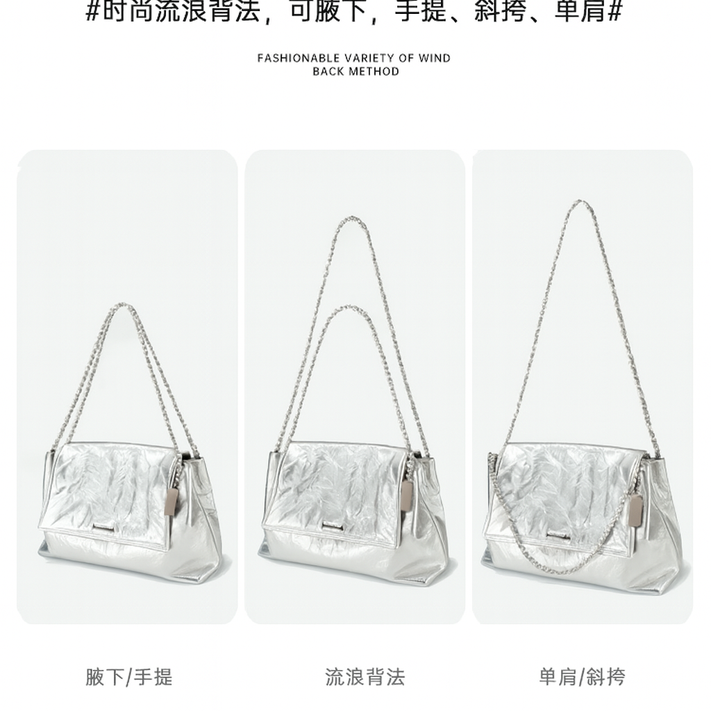 小众链条单肩斜挎托特包女牛皮大容量腋下通勤邮差包 (DF2321-银色) *仅限使用消费积分50%*
