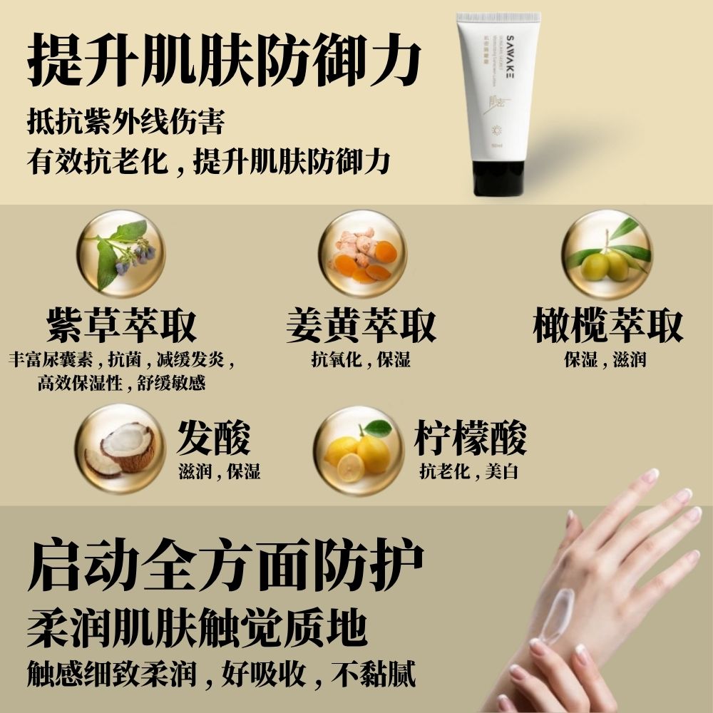 Activates comprehensive protection to enhance the skin's self-defense capabilities. Protection combined with hydration, featuring natural, potent skincare ingredients. Comfrey extract strengthens protective power, while turmeric extract enhances moisturizing and antioxidant effects, boosting the skin's ability to fight daily external aggressions like air pollution and free radicals, maintaining optimal hydration levels